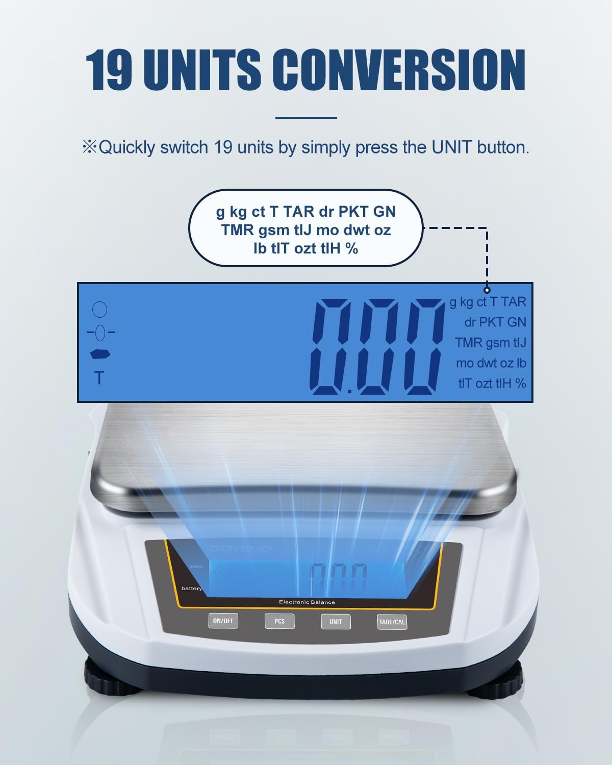 - Switch Seamlessly Between Multiple Units such as grams, ounces, carats, and pounds, providing versatility for weighing ingredients, jewelry, or lab materials.