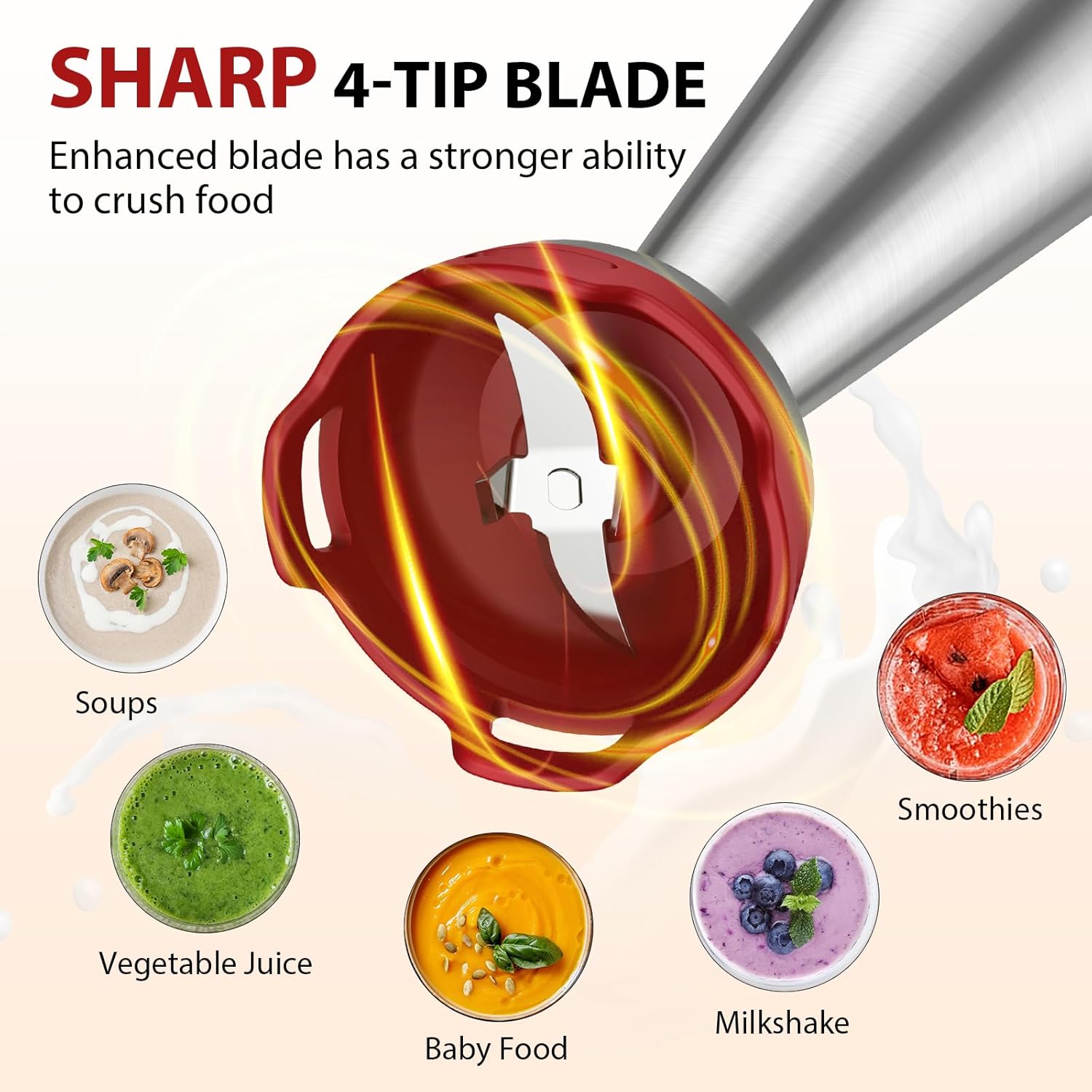 - 1000W Motor & 304 Stainless Steel 4-tip Blade: Compared with other 300-500W motors, upgraded KOIOS handheld blender is equipped with a 1000W all-copper motor, which is more powerful and has a stronger ability to crush food. With 304 food-grade stainless steel blades, this material has good oxidation resistance and high temperature resistance. Safe to use even in hot soup.