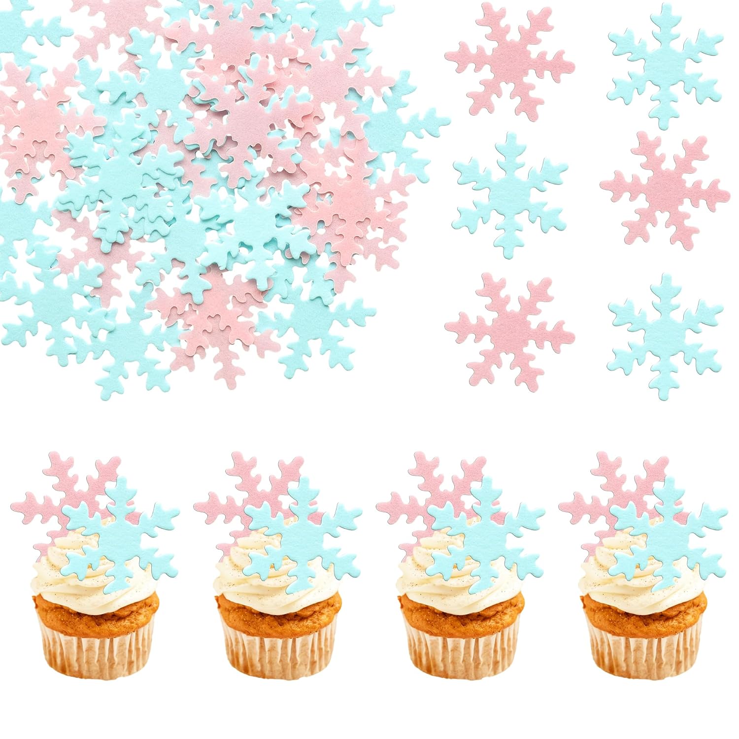 - ❄Premium Material: These snowflake cupcake toppers are made of wafer rice paper, it is completely edible but not delicious, They are virtually tasteless, not sweet at all and are sugar free, very safe to put them on cakes, cupcakes, ice cream, fruits, pie, dessert, cheese or any dish and food appetizer you want to decorate.