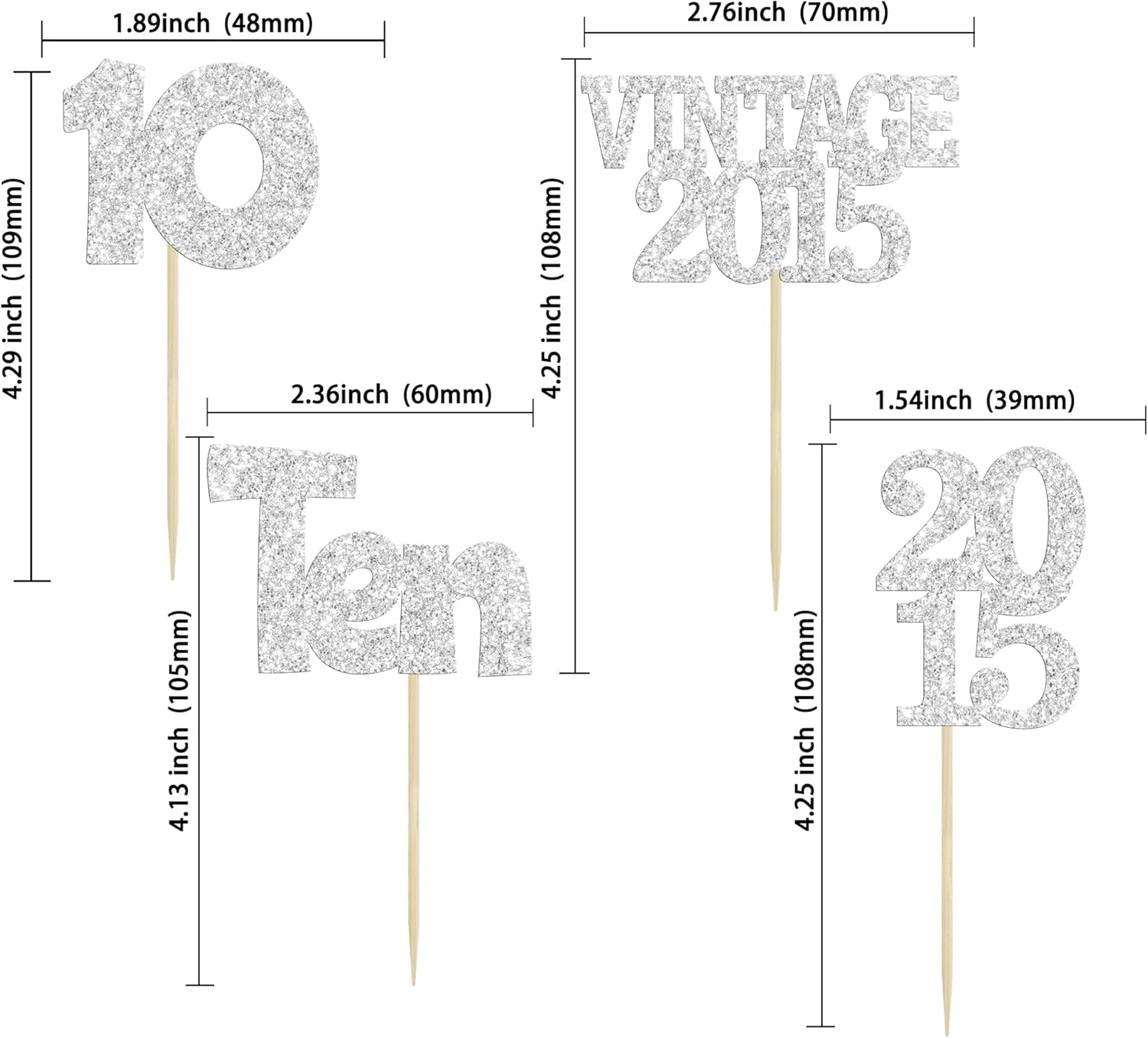Gyufise 24Pcs 10th Birthday Cupcake Toppers Glitter Ten Vintage 2015 Hello 10 Years Birthday 10 Cupcake Picks Double Digits Cake Decorations for Happy 10th Birthday Anniversary Party Supplies Silver