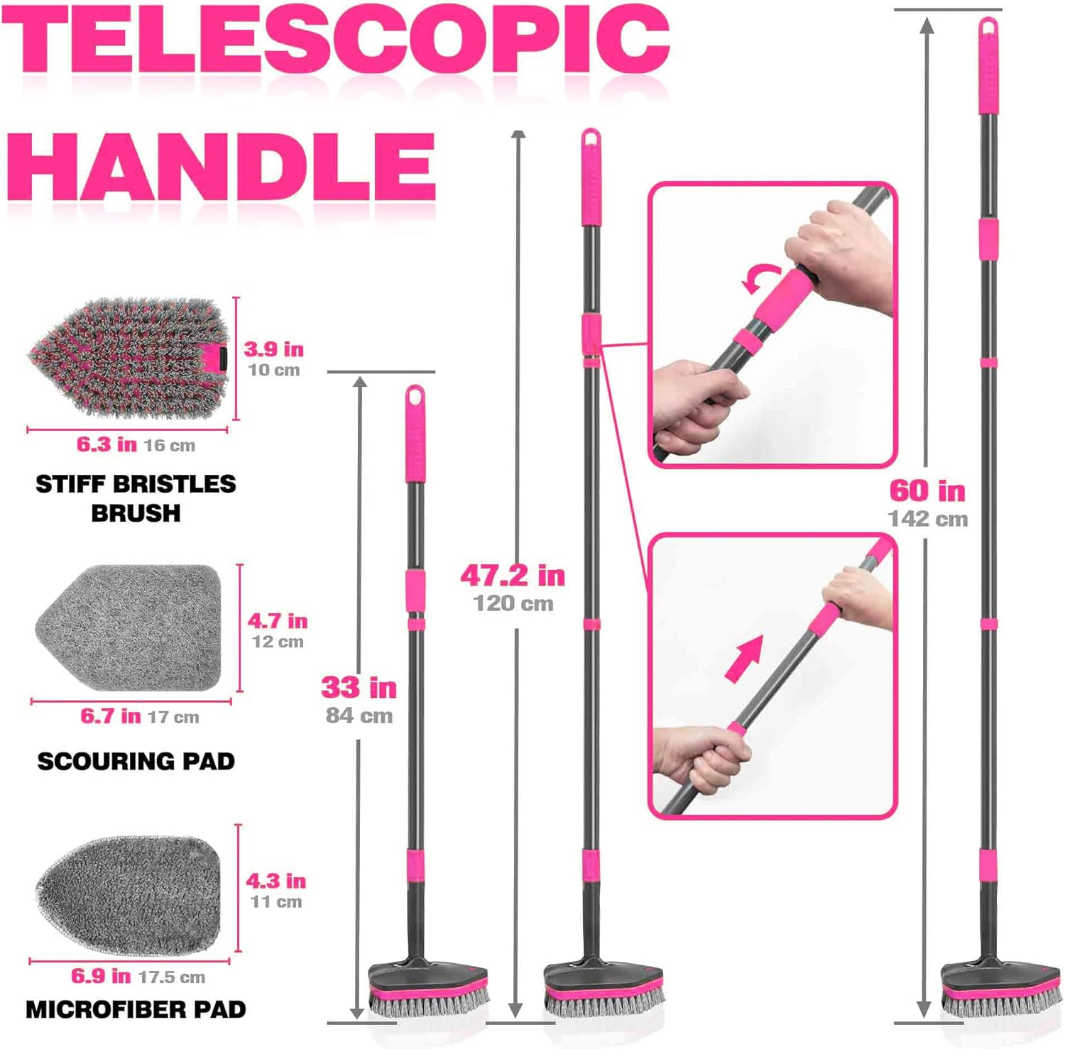 - Want to Effortlessly Clean Bathtub? This shower scrubber with long handle can be adjusted from 47.2” to 60” with a quick twist, eliminating the need for bending, climbing, stretching, kneeling, or crouching while cleaning