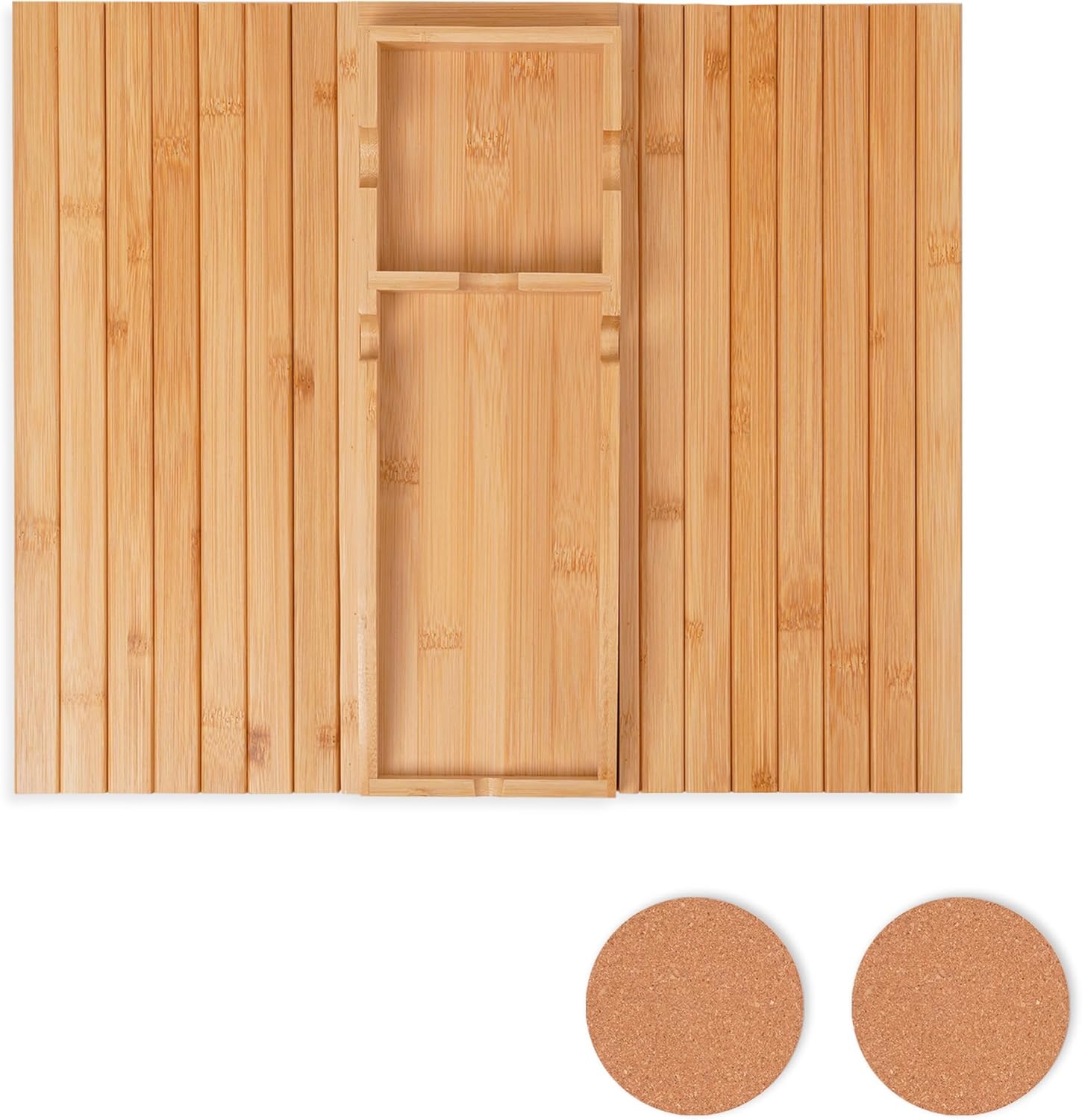 Foldable Couch Cup Holder with 2 Cork Coasters – Detachable Bamboo Sofa Tray, Anti-Slip Sofa Armrest Caddy for Drinks, Snacks, Laptops, & Bathtub – Perfect Home & Gift Accessory