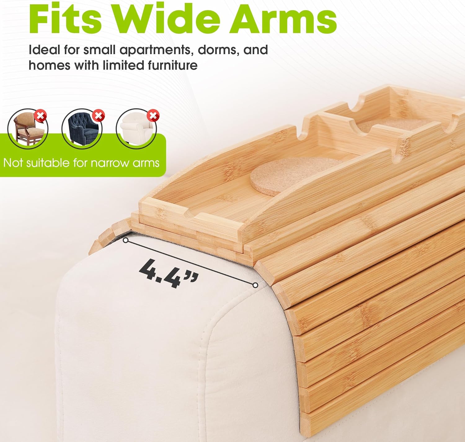 - Multi-Functional Use: Turn your bath into a luxury retreat! This tray rests securely on tub edges, holding wine, candles, or a book. Durable, waterproof materials make it ideal for creating a serene, clutter-free relaxation zone. Sofa armrest tray with a built-in cup holder, designed to fit armrests ranging from 4.5” (flat) to 14” wide, whether rolled or straight. The cup holder accommodates cups up to 3.5” in diameter.