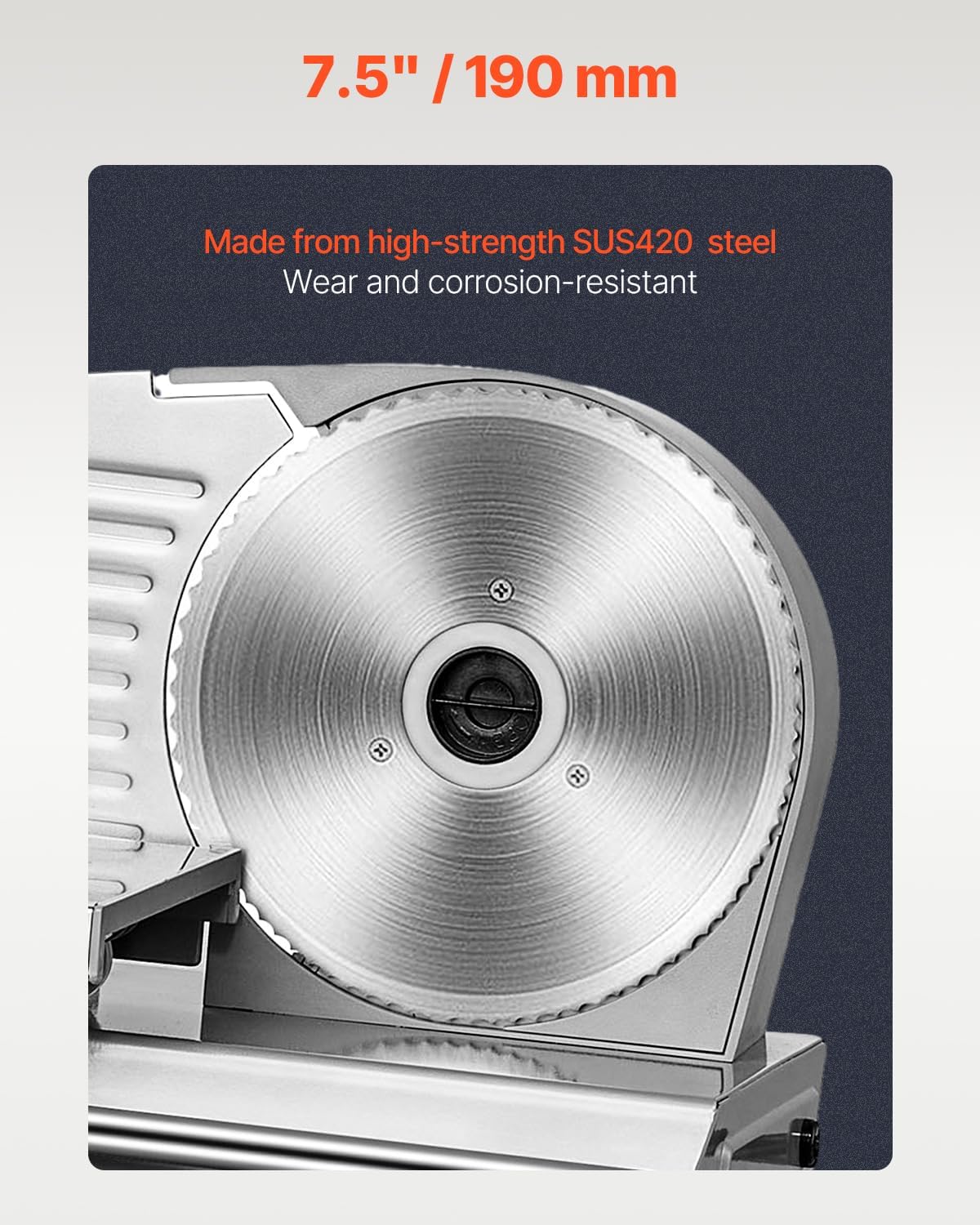 - 7.5" Stainless Steel Blade: Our meat slicer is equipped with upgraded 7.5" wide SUS420 stainless steel blade, effortlessly handling various food textures such as frozen meat, cheese, ham, and bread.