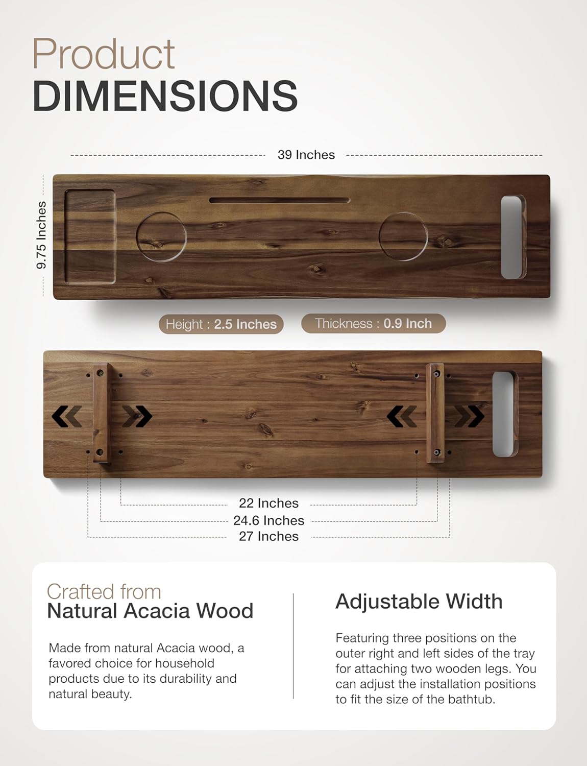 - Premium Acacia Wood Construction: Crafted from high-quality Acacia wood, this bathtub tray table boasts a natural and distinctive wood grain pattern, making each piece unique