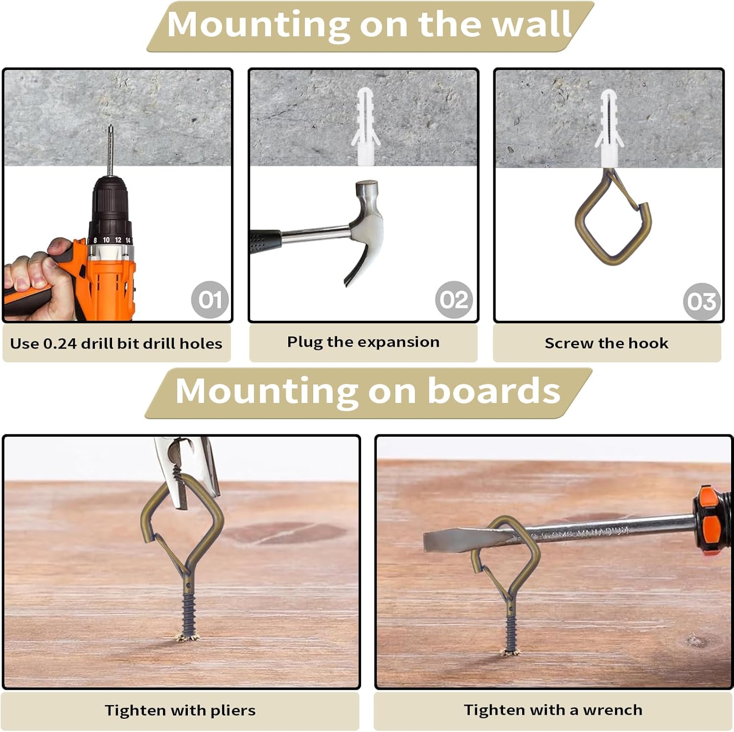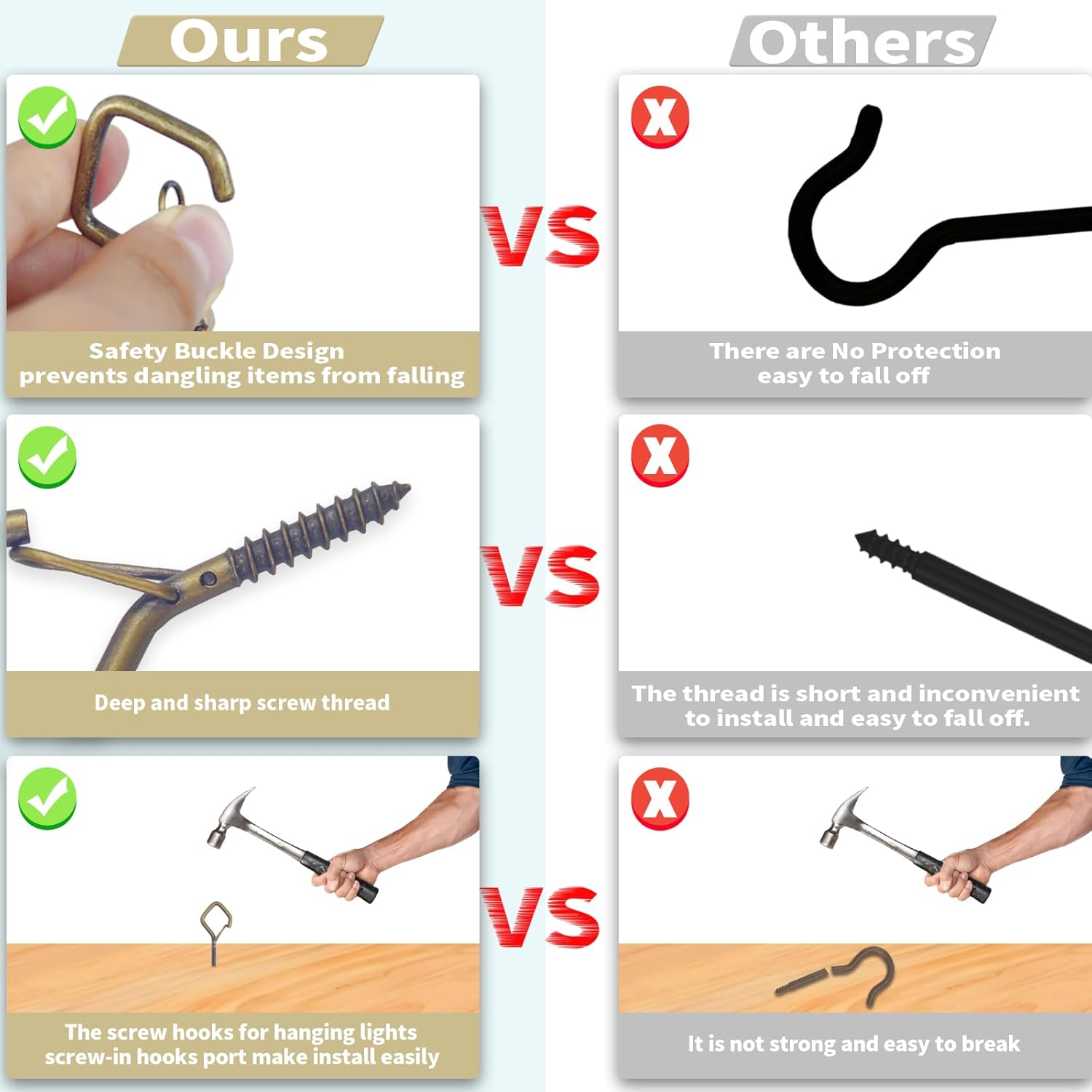 - đ§ăEasy Screw-In Installationă Simply twist into wood, ceilings, beams, fences, or walls for instant hanging support. 2.36-inch length provides a firm hold.