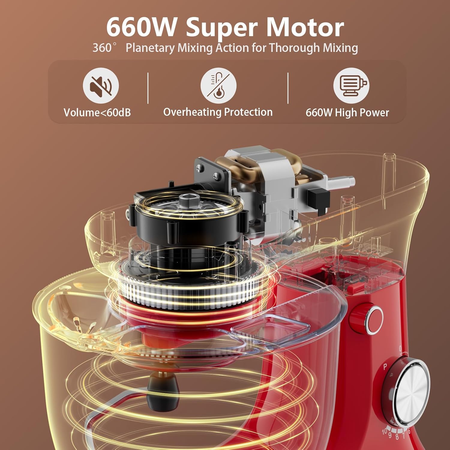 - 660W POWERFUL DYNAMICS - Powered by a precision-engineered 660W motor with copper-core technology, this mixer delivers high-torque performance . Its smart energy algorithm reduces power consumption by 35% compared to conventional models. The dual-cooling system ensures continuous 1-hour operation without overheating.