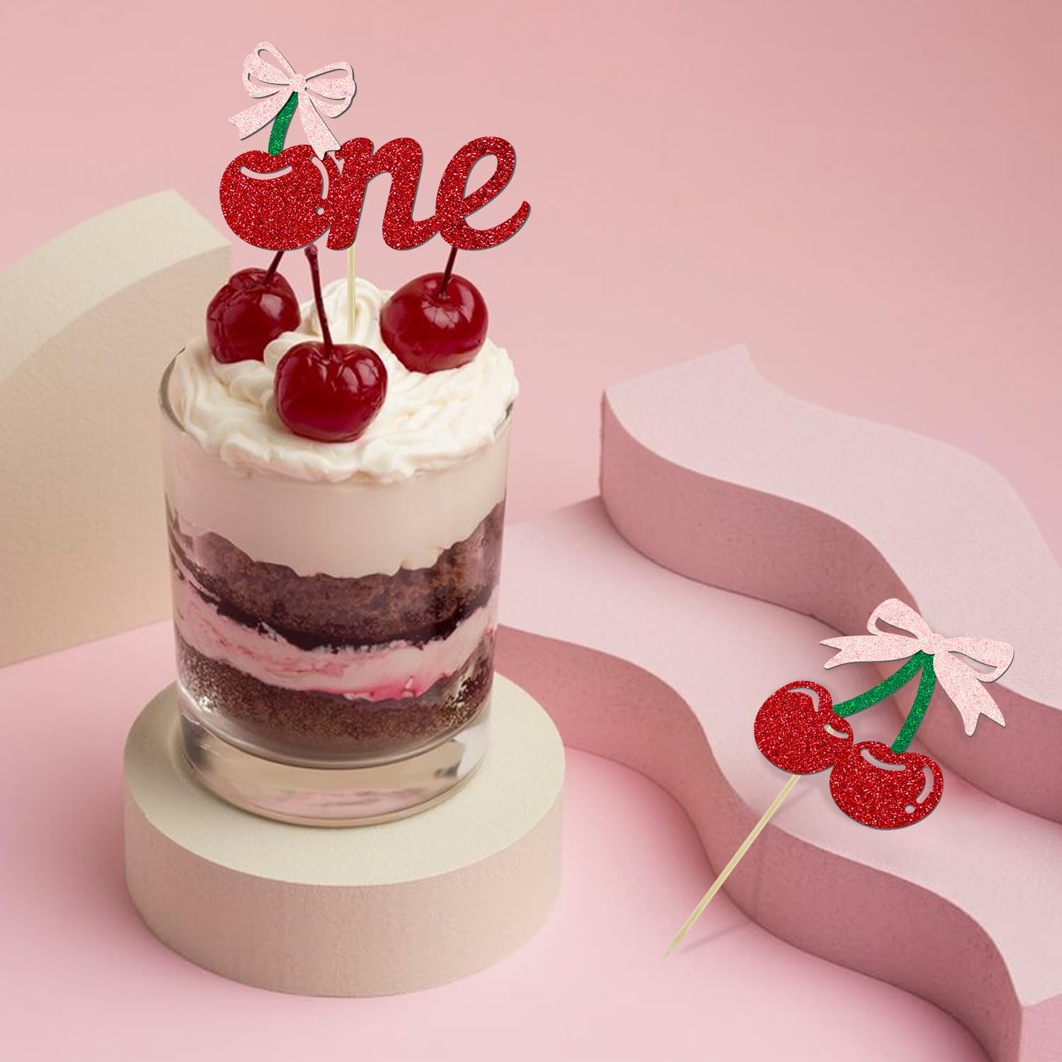24 Pack Cherry 1st Birthday Cupcake Toppers, Glitter Cherry First Birthday Cake Pick for Fruits Theme One Birthday Party Cake Decorations Supplies (One)