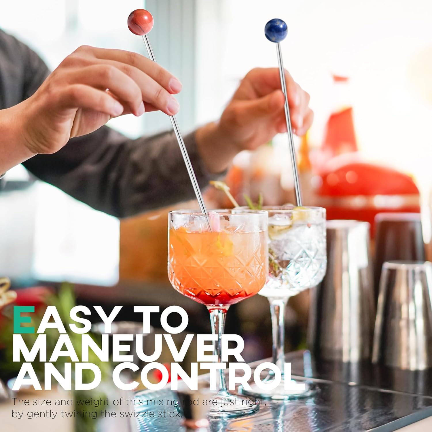 - OPERATION: The stirrer's head is adorned with a natural gemstone decoration, not only adds a touch of character to your barware but also serves as a functional handle, making it easy to maneuver and control the rod with precision. The size and weight of this mixing sticks are just right, by gently twirling the swizzle stick, you can effectively blend the flavors without disturbing the ice or garnishes.
