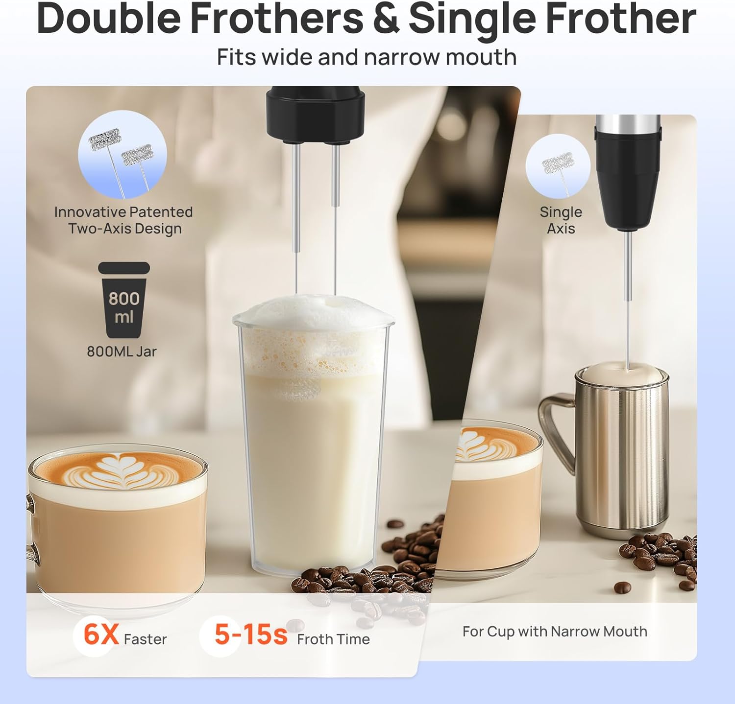 - ă3 Dual Drive Shaft Attachmentsă - The innovative dual shaft design allows for faster and more thorough blending. /Double Frothers/ Froths 200ml of milk in just 5-15s, 6x faster than others; /Double Beaters/ 4x faster to whip eggs. Even function as hand mixers for batter, dough, and other heavy mixtures; /Double Hooks/ Kneading thick bread or pizza doughs and mixing batter without the effort