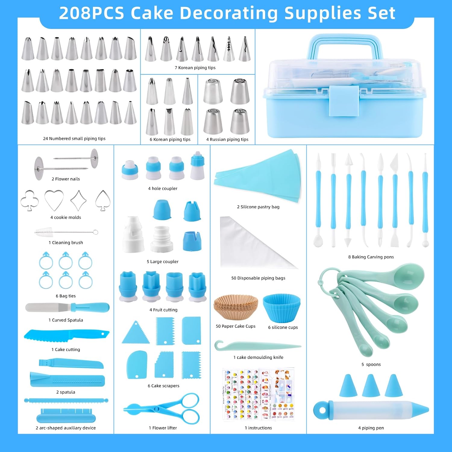 Cake Decorating Kit: Decorating Supplies Tools Kit 208 PCS Baking Accessories Include Spiping Bags and Tips Set, Piping Tips Set, Spatulas, Cake Scraper, 50 Piping Bags, Blue