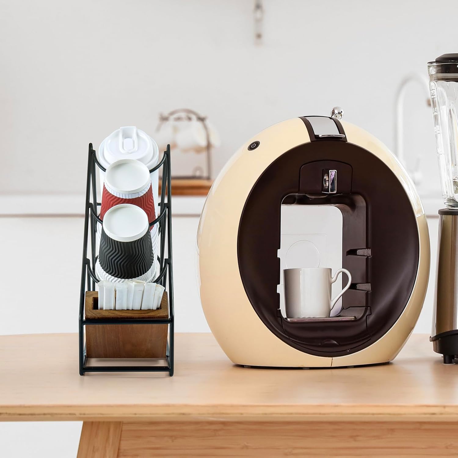 MyGift Industrial Matte Black Metal Wire & Acacia Wood Countertop Disposable Coffee Cup Organizer – Holder Rack for Cups, Lids, Straws, and Stirrers