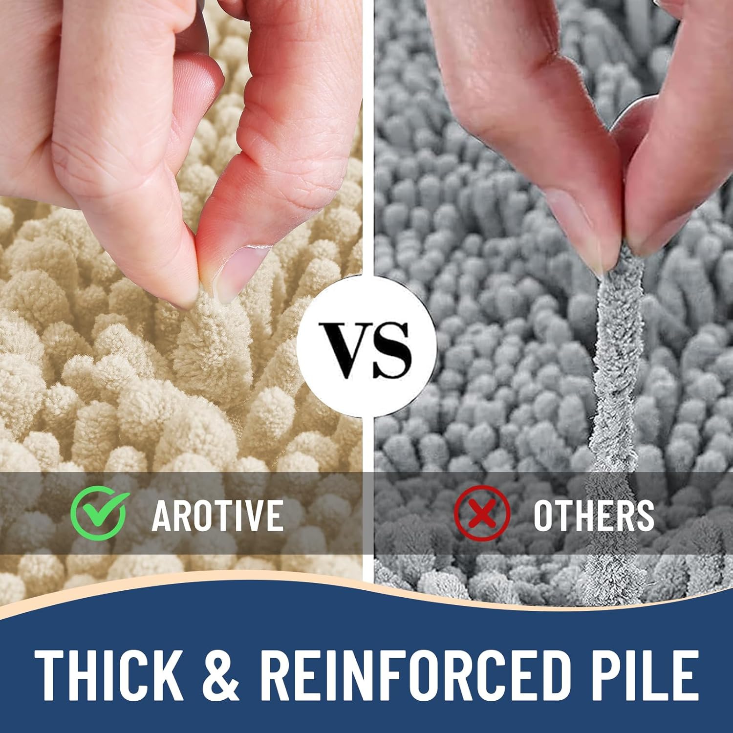 - Anti-Skid Backing: Arotive chenille bathroom rugs feature a non-slip bottom consisting of sturdy mesh PVC material that stops the bath mat from shifting and skidding. The middle layer is 4 mm memory foam, which can let you feel more comfortable when wrapping into the rugs. WARNING: Place bath mat on CLEAN DRY FLAT FLOOR ONLY. Water under bath rug can cause it to slip. Always keep the bottom of bath rug dry