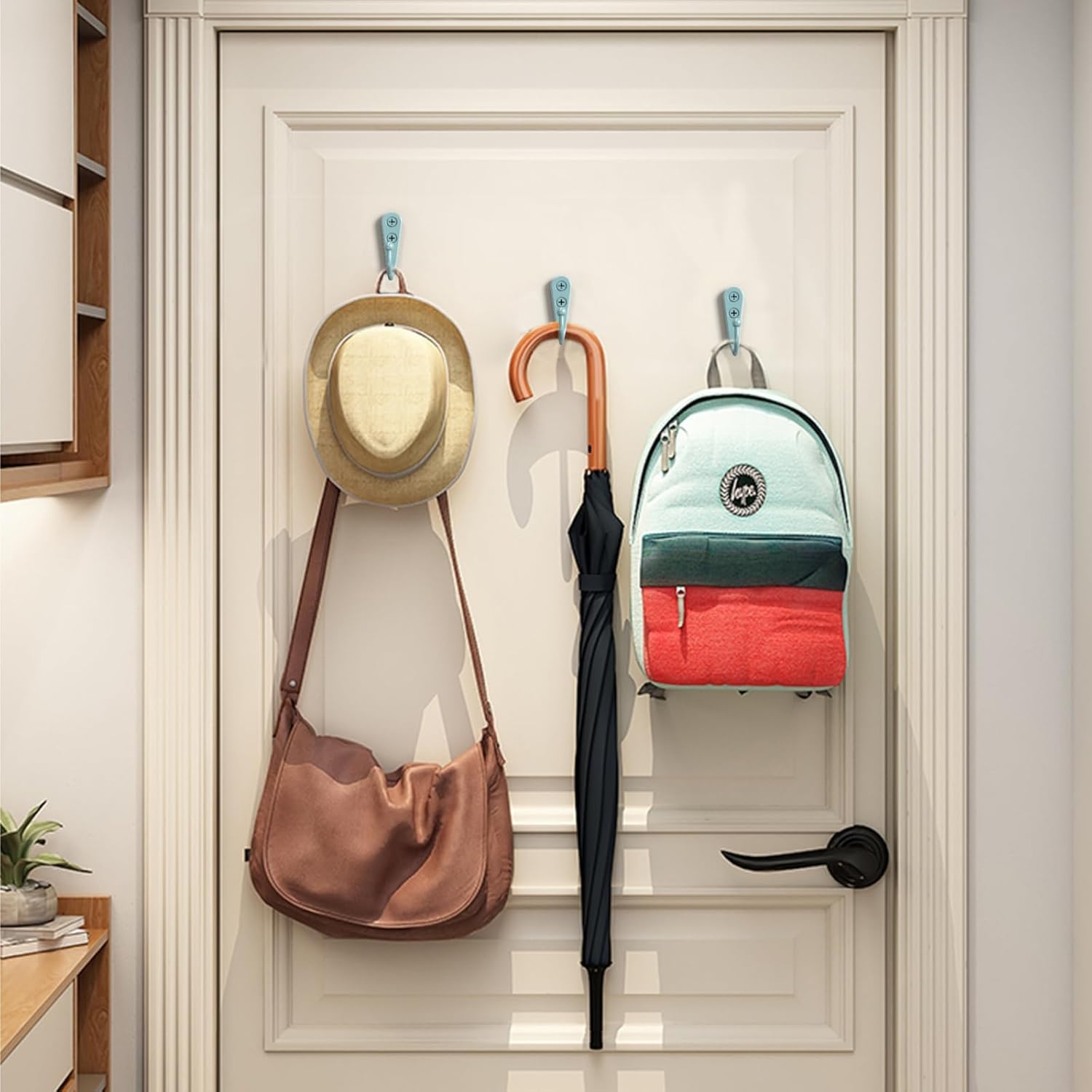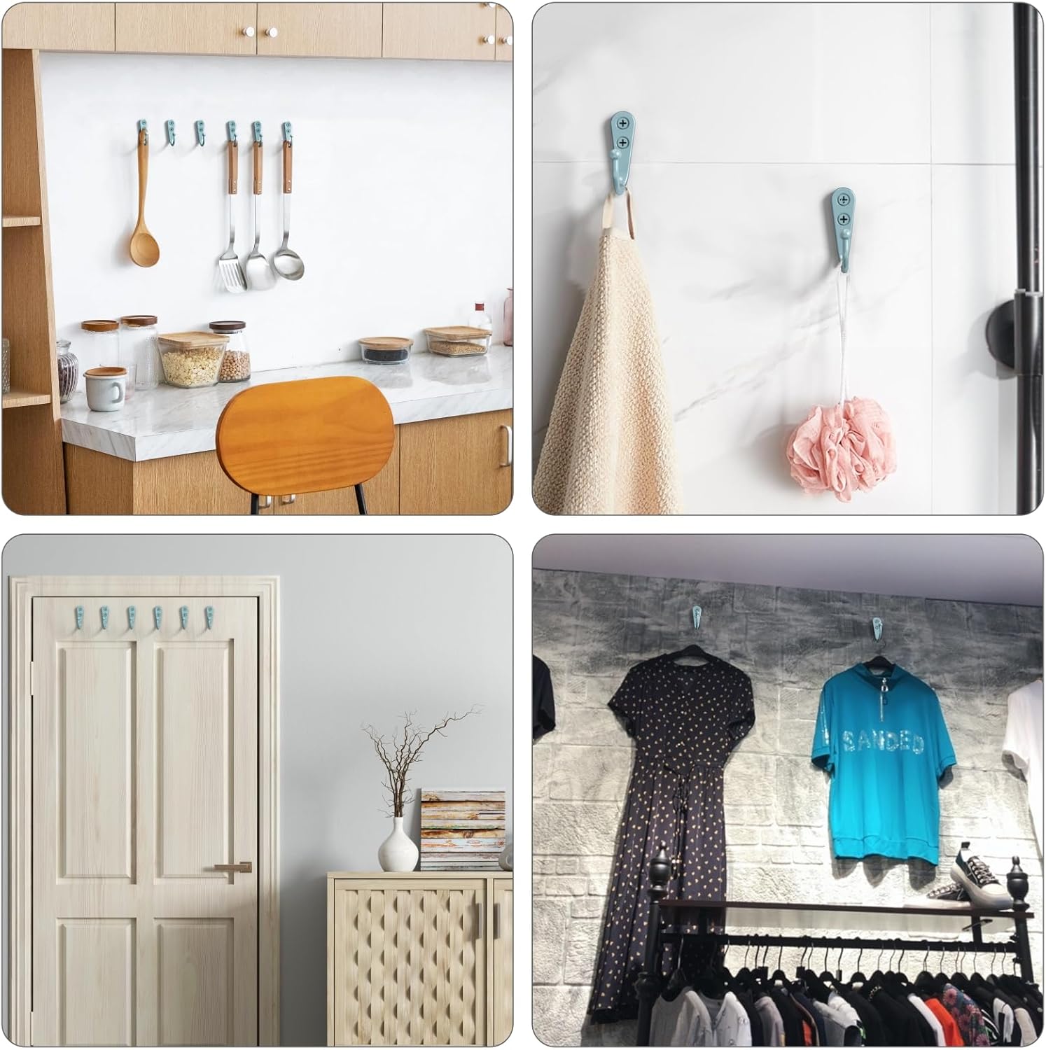 - Wide Application: You can use these hooks in bathrooms, closets, kitchen and garage, to hang various items, such as necklaces, coffee cup, cup, coats, belts, handbags, jewelry pieces, baskets, cooking ware, keys and so on