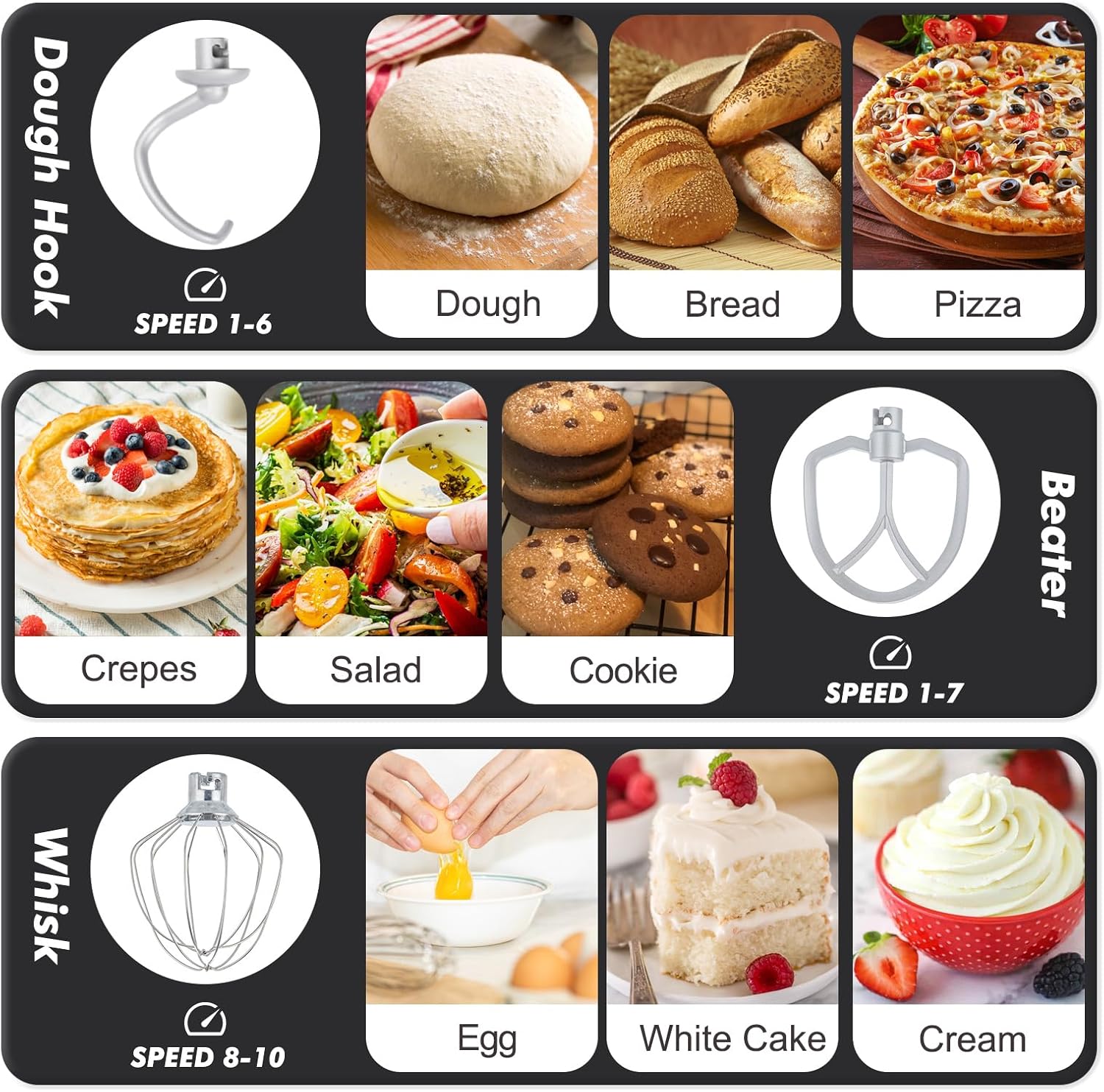 - ă10-Speed Power & Stable Mixingă Tackle any recipe confidently with 10 precise speeds. This small electric kitchen mixer can mix thick bread dough, whip cream, blend batters, or gently stir delicate ingredients â all with optimal control. 4 strong suction cups firmly anchor the compact stand mixer to your countertop, preventing wobbling or walking during use.