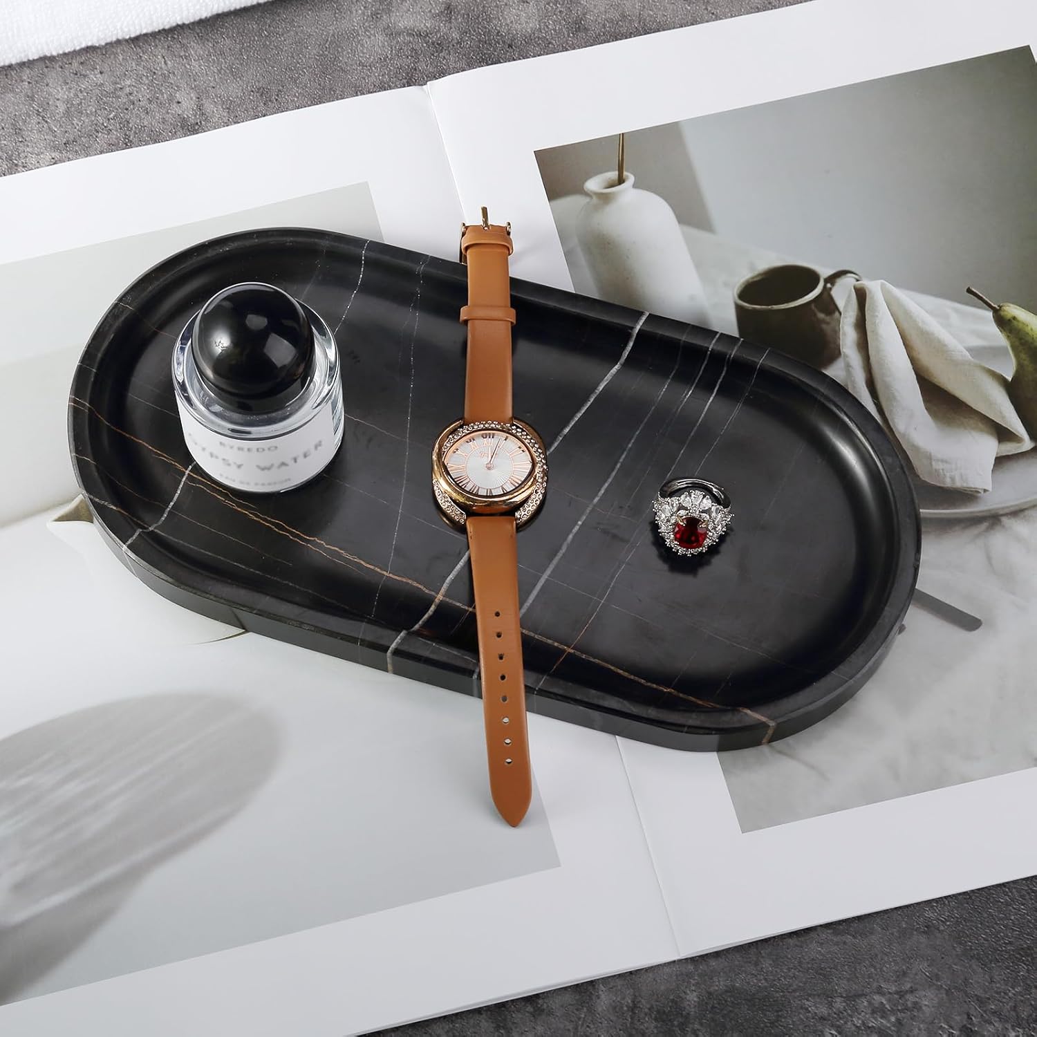 - Elegant Black Marble with Natural Veining Each tray features unique white streaks on deep black marble, making every piece one-of-a-kind