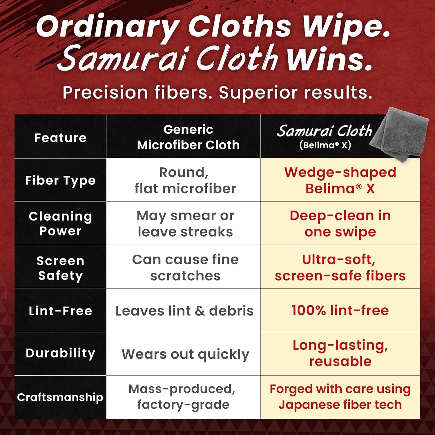 - 🇯🇵 「Crafted in Japan, Powered by Belima X」Samurai Cloth uses wedge-shaped fibers that lift smudges better than ordinary round microfiber, delivering streak-free clarity and lasting performance.